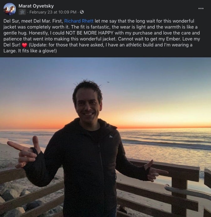 "Great fitting jacket that punches above its warmth weight! Fabulous customer service." Sean H.