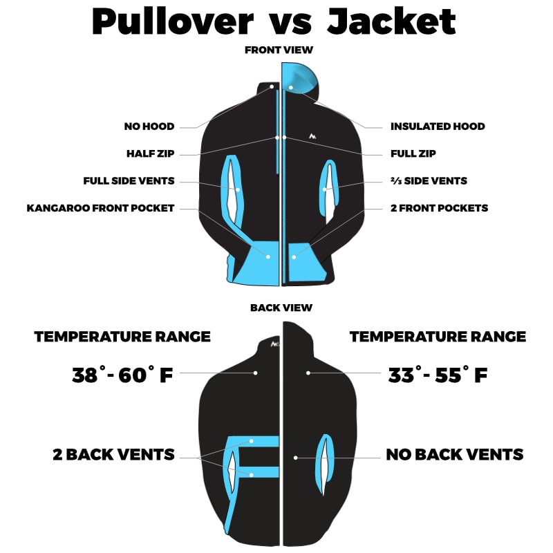 We created two distinct styles, the Pullover (half zip, no hood) and the Jacket (full zip, with hood).